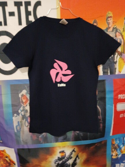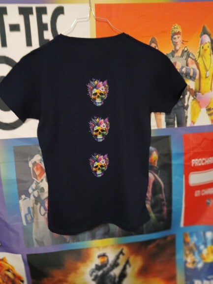 T-shirt noir fille personnalisé d'un motif "FaMaShirts" ainsi qu'un motif dorsale "crâne fleurit"